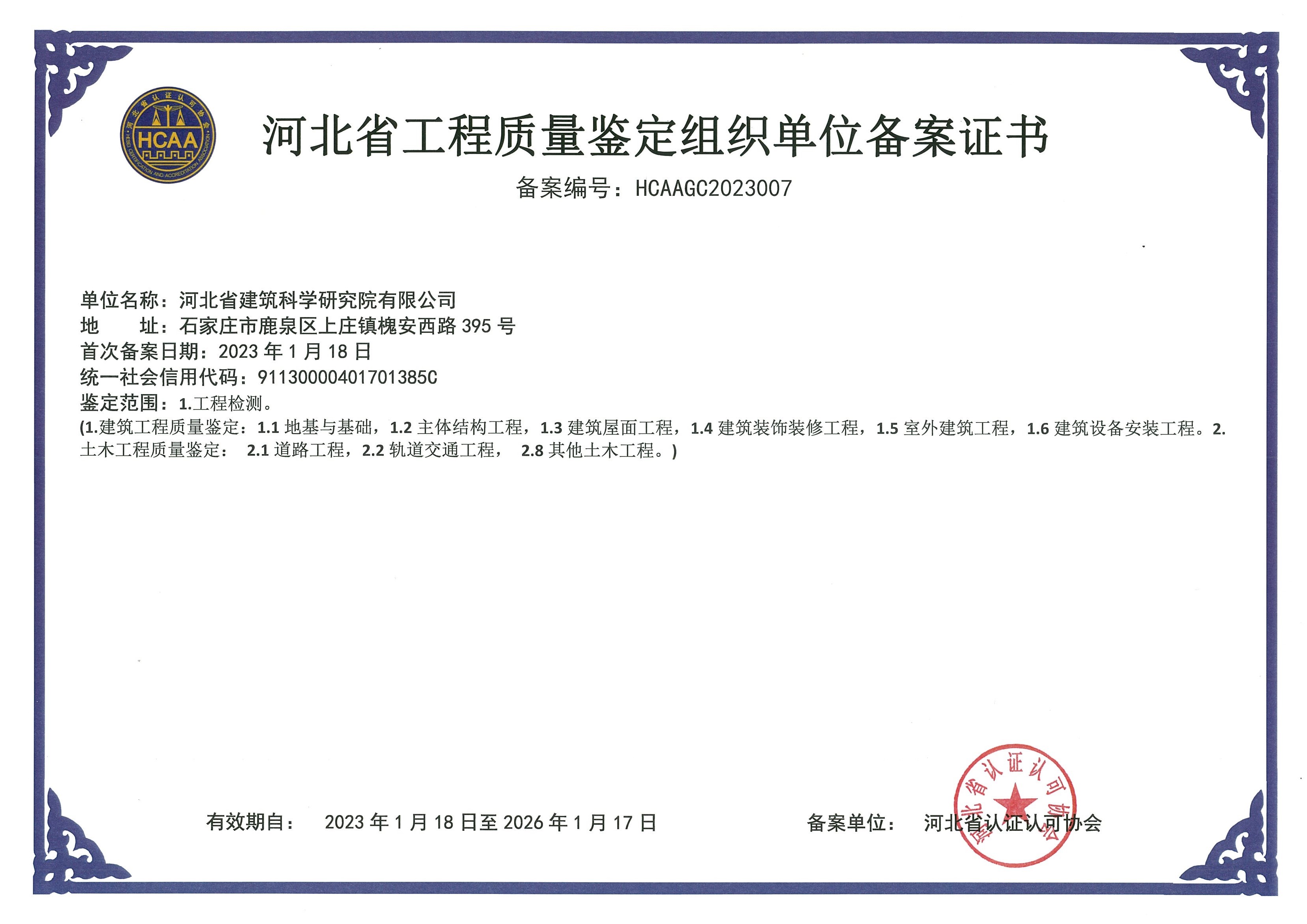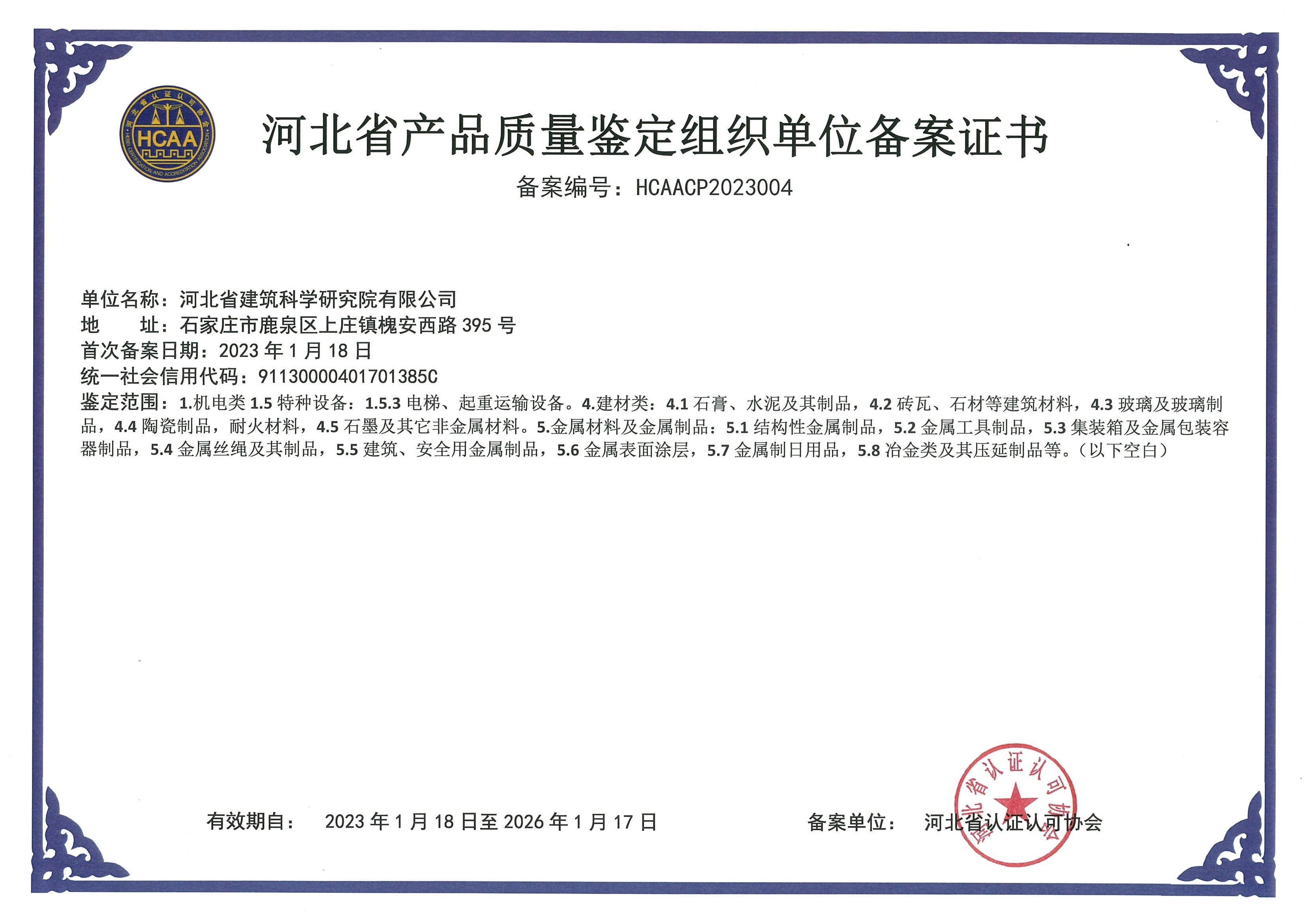 河北省建筑科學研究院有限公司產品質量鑒定組織單位備案證書1